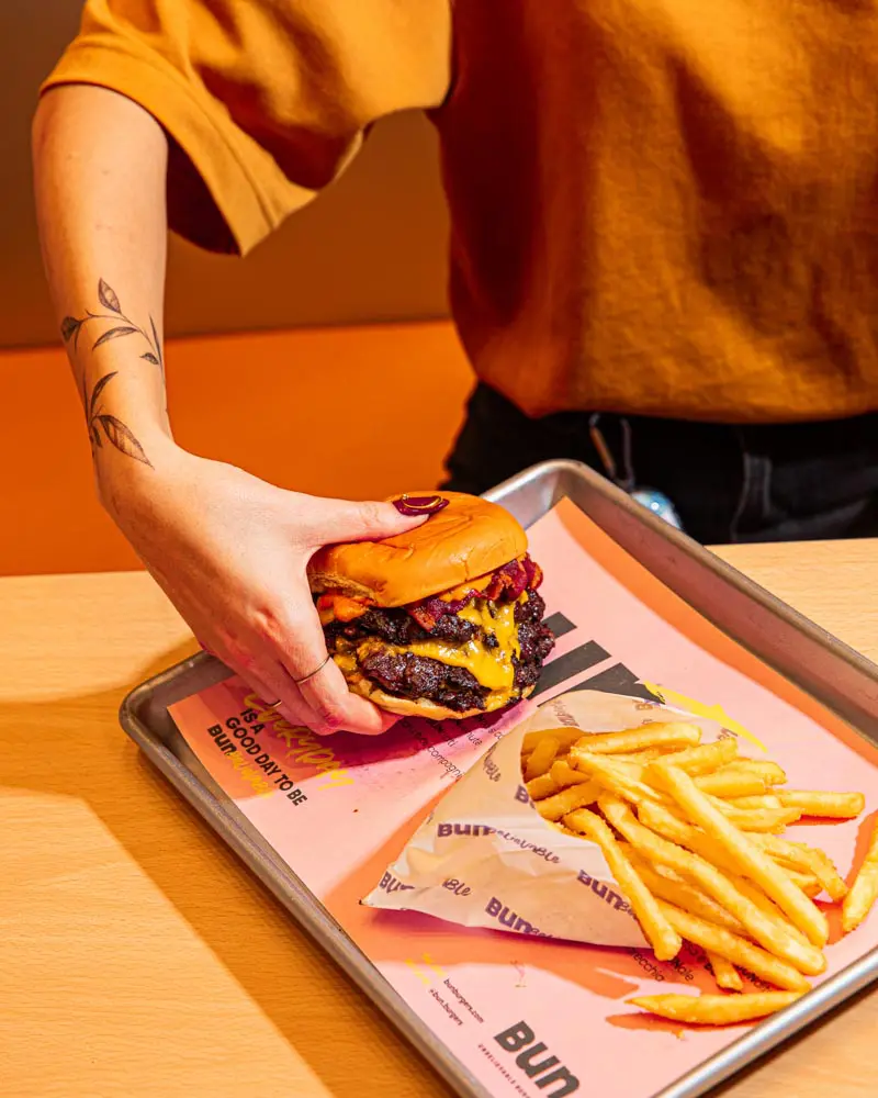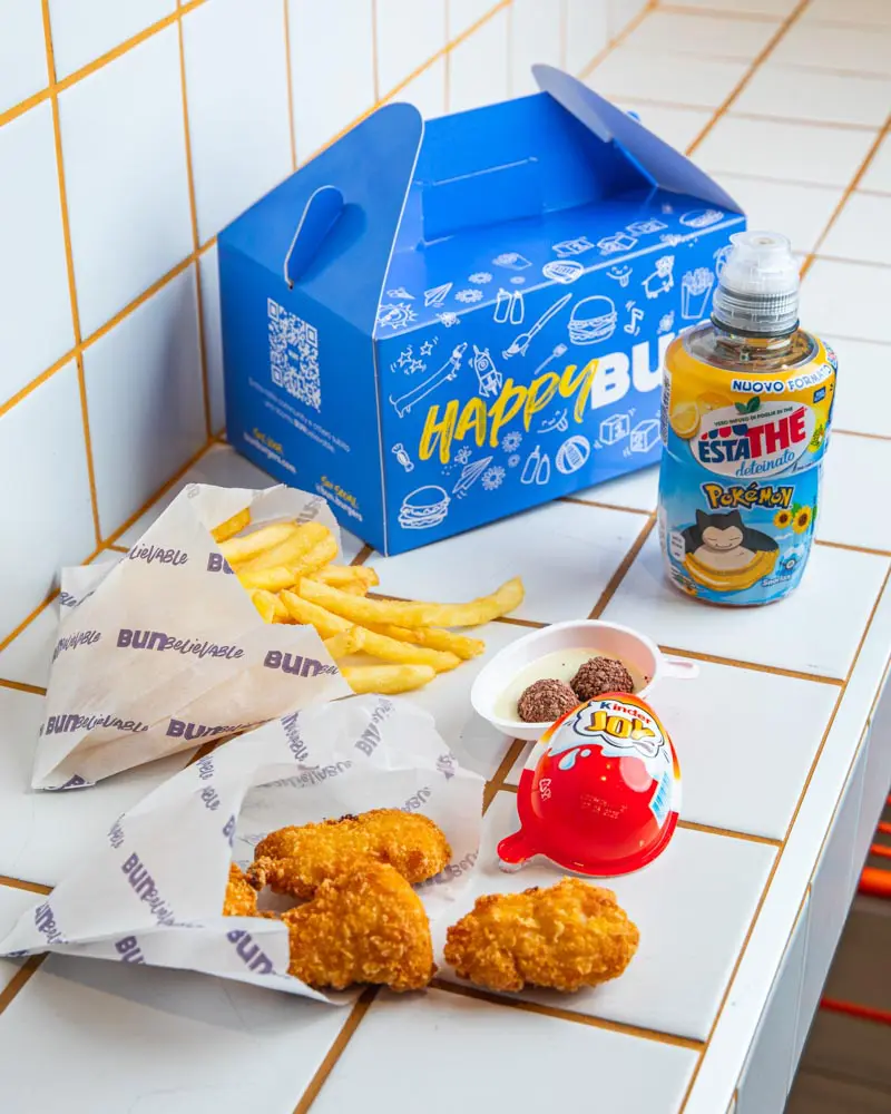 Bun è un fast food in cui buon cibo, design e qualità si uniscono per creare un’esperienza rivoluzionaria. Bun propone una tipologia di hamburger proveniente dagli Stati Uniti, lo smashed burger, caratterizzato da una tecnica di cottura che consiste nello schiacciare il patty di carne sulle piastra. Il risultato che si ottiene è un hamburger saporito, croccante all’esterno e succoso all’interno. Uno dei valori fondamentali di Bun è l’inclusività, e questa si riflette anche nel menù, che è interamente convertibile in versione plant based con hamburger di Beyond Meat. Viene definita come “carne-non-carne” ed è un prodotto di origine proteica, completamente vegetale, dal sapore e dalla consistenza praticamente sovrapponibile all’alternativa di origine animale. Bun è il primo fast food in Italia a proporre tutto il menù interamente convertibile in versione vegetariana. L’offerta di prodotto di Bun prevede anche delle alternative innovative, quali il protein burger, che al posto del pane ha intorno una foglia di insalata, e il Bau Bun, un menù pensato per gli amici a quattro zampe.